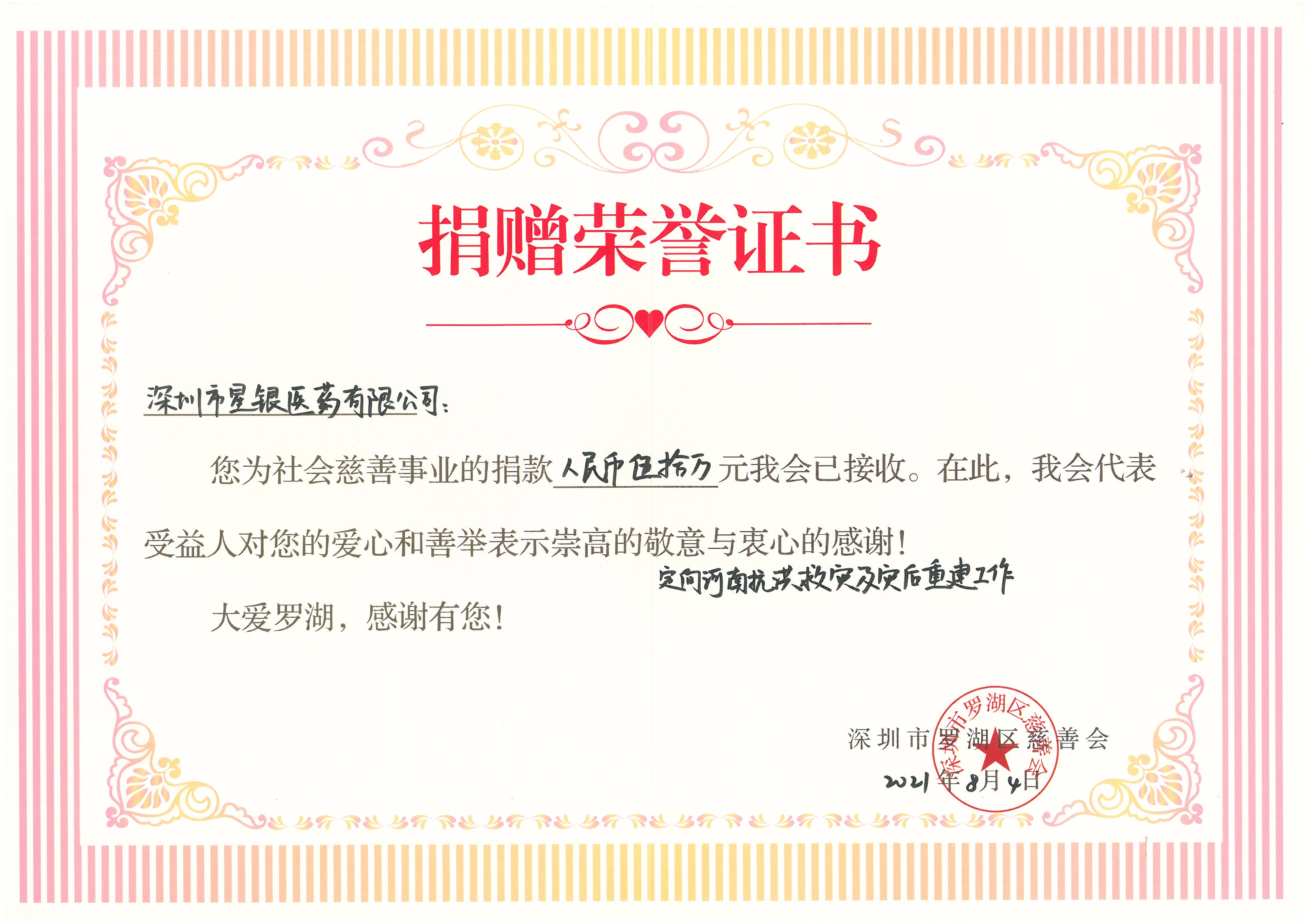 21/09-14Xingyin Pharmaceutical donated 500,000 yuan in cash to support flood relief and post-disaster reconstruction in Henan Since July 17, many places in Henan have suffered extreme heavy rainfall and natural disasters such as waterlogging, mudslides and landslides caused by it, causing major casualties in the local area.